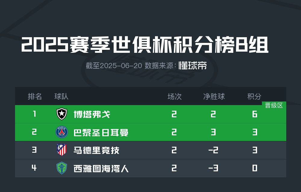 2025年世俱杯B组小组赛前两轮战罢,博塔弗戈2轮全胜取得6分,马竞和巴黎各赢一场积3分,西雅图海湾人一分未拿。